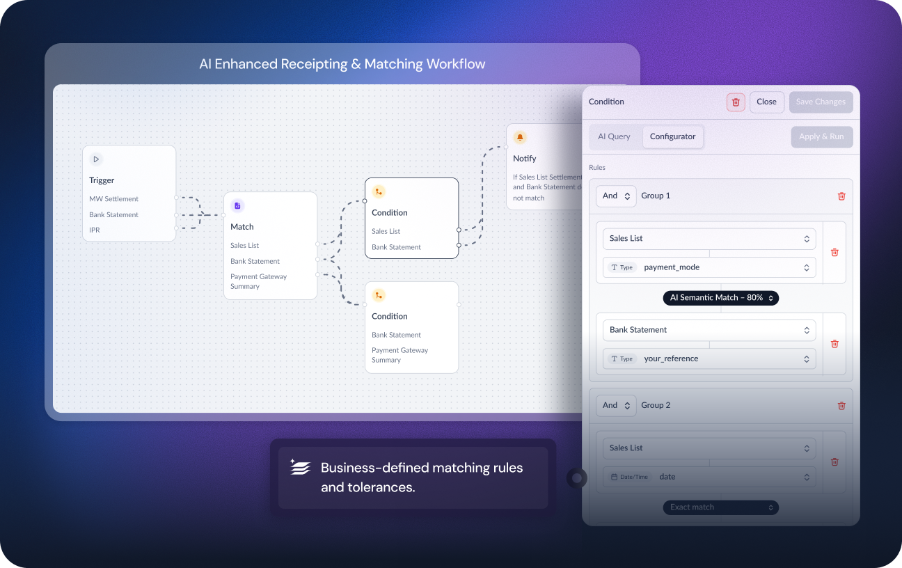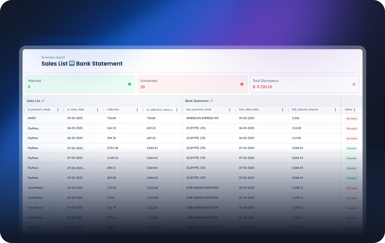 Simplify your most complex data checks. We streamline N-way matching across bank, GL, and subledger data to spot discrepancies instantly, removing the need for manual modeling or brittle rules.